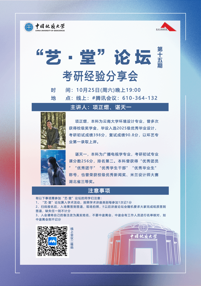 为帮助同学们明确考研方向、优化备考策略,10月25日晚上19:00,艺术与传媒学院“艺・堂”论坛第十五期(学风建设系列第八期)考研经验分享会在线上腾讯会议举行。本次分享会邀请环境设计专业考研高分上岸的项正熠与新闻传播学备考经验丰富的谌天一担任主讲人,为参会同学带来干货满满的考研指导,助力大家高效备战。