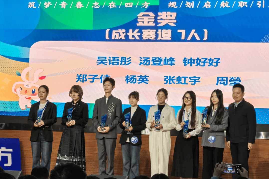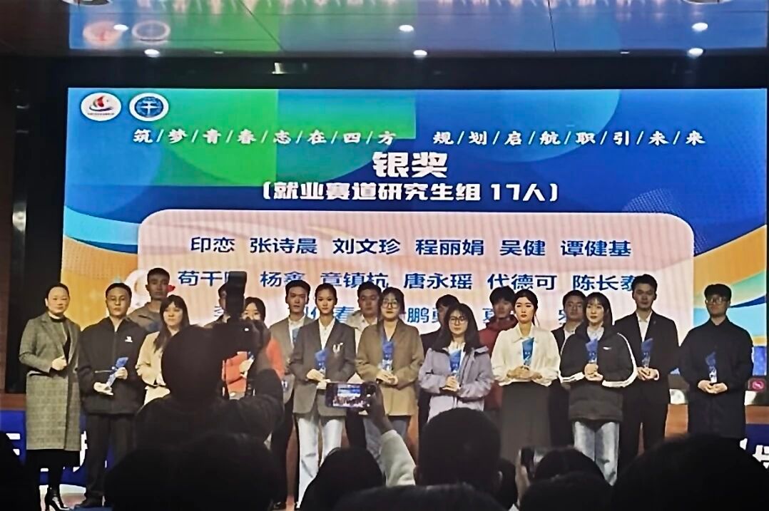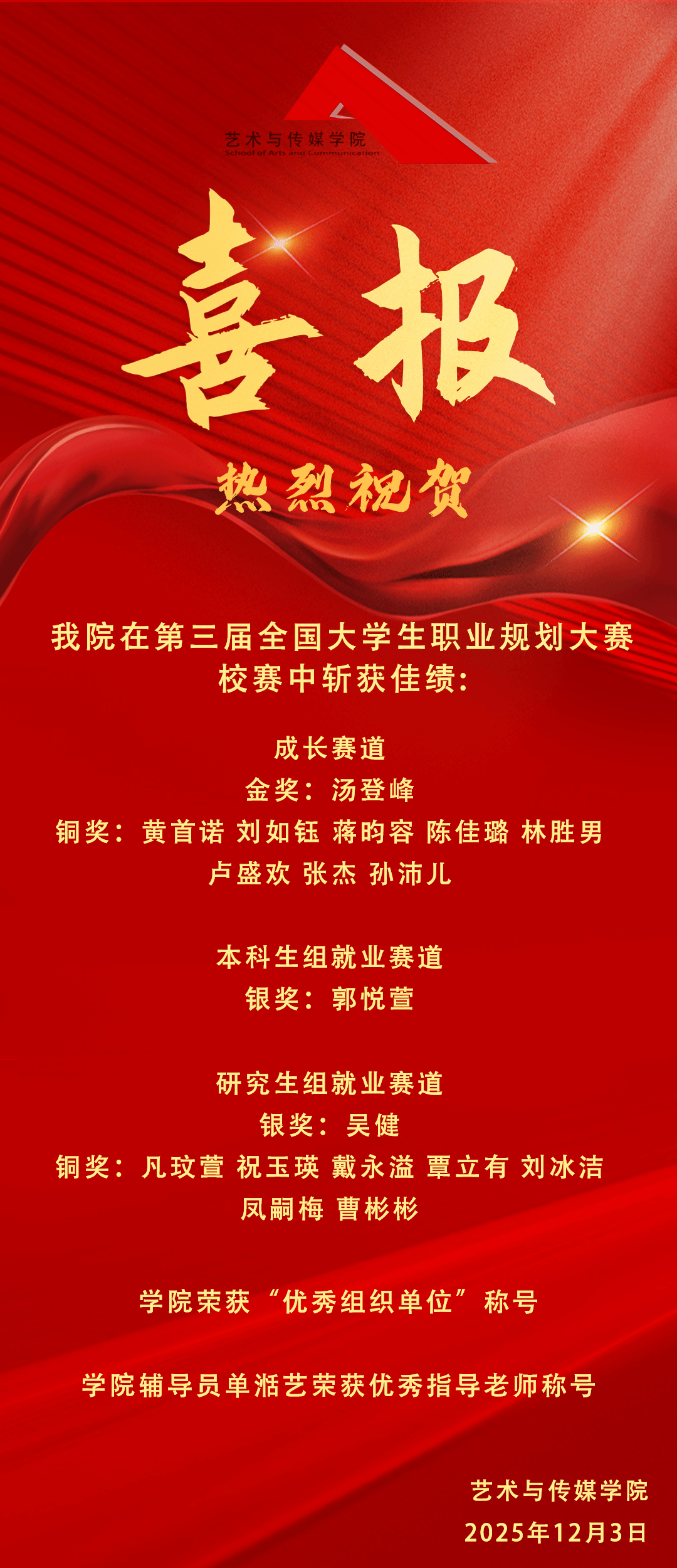 在本次比赛中,艺术与传媒学院的同学们表现出色,斩获多项荣誉。成长赛道方面,汤登峰荣获校级金奖,黄首诺、刘如钰、蒋昀容、陈佳璐、林胜男、卢盛欢、张杰、孙沛儿荣获校级铜奖;就业赛道方面,郭悦萱荣获本科生组校级银奖,吴健荣获研究生组校级银奖,凡玟萱、祝玉瑛、戴永溢、覃立有、刘冰洁、凤嗣梅、曹彬彬荣获校级铜奖。此外,艺术与传媒学院荣获“优秀组织单位”称号,学院专职辅导员单湉艺老师荣获“优秀指导老师”称号。