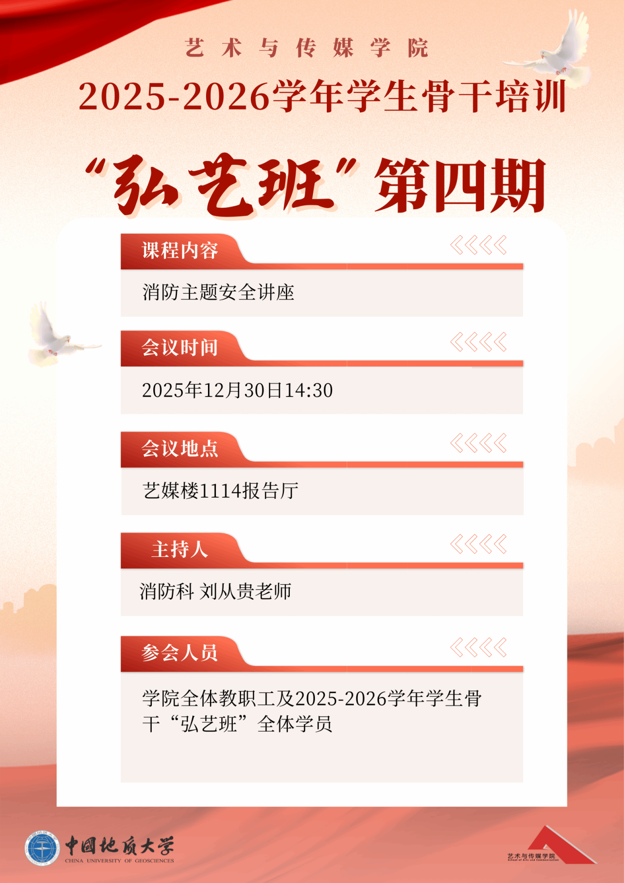 2025年12月30日,艺术与传媒学院在艺媒楼1114报告厅顺利开展2025-2026学年学生骨干培训“弘艺班”第四期,本次消防主题安全讲座由安全保卫部消防科科长刘从贵老师主讲,聚焦于筑牢校园安全防线,助力同学们增强消防意识、提升突发事件应对水平。学院全体教职工,研究生会、学生会、分团委全体学生骨干,各班班委,楼栋长,楼层长,寝室长参加了本次培训。