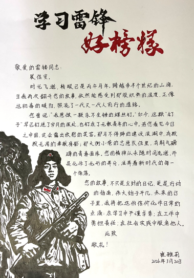组织学生以手写信形式向雷锋同志表达敬意和感悟,通过文字抒发理想信念和精神追求。信件内容真实质朴、情感真挚,充分体现了青年学生对榜样力量的认同与传承。共征集作品32份,并在地大艺媒党员之家平台集中展示。