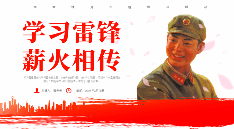 2026年3月20日晚19:00,视觉传达设计学生第一党支部在支部书记祖予希带领下进行“学习雷锋,薪火相传”线上学习活动,支部全体党员、发展对象、入党积极分子参与本次学习。本次学习主要由雷锋生平介绍、雷锋纪念日、雷锋名言录、观看雷锋纪录片、心得分享五部分构成。