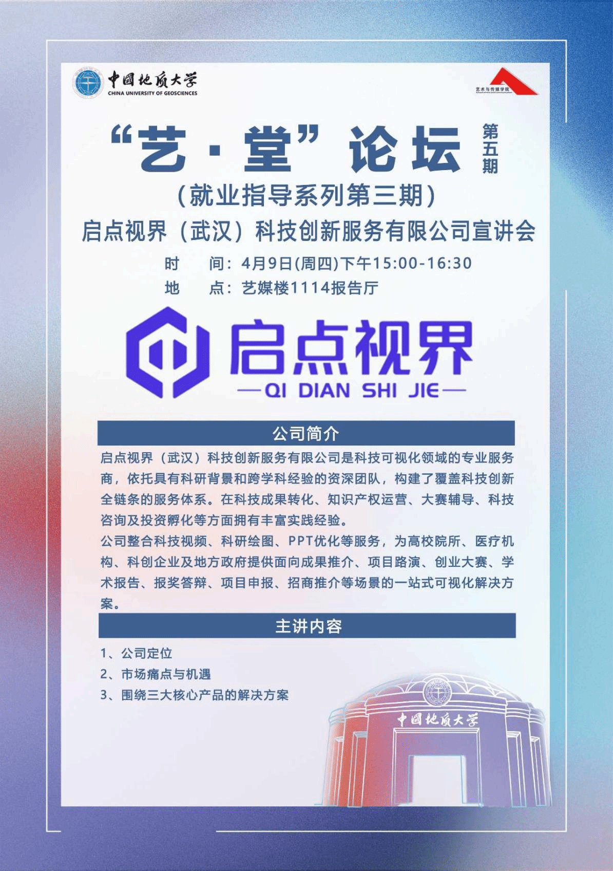 (通讯员:黄灿)2026年4月9日下午15:00,“艺·堂”论坛第五期——就业指导系列宣讲会于艺媒楼1114报告厅顺利举行。本次分享会邀请了启点视界(武汉)科技创新服务有限公司来学院进行宣讲,活动由兼职辅导员黄灿主持。
