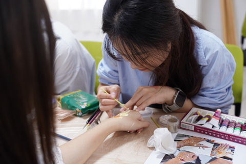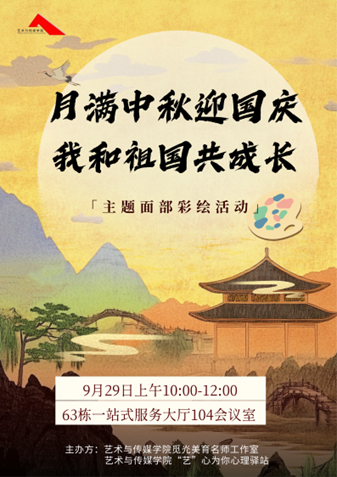 在国庆与中秋双节来临之际,为传承中华传统文化、营造温馨浓厚的节日氛围,9月 29 日上午,由后勤保障部学生住宿服务中心、本科生院主办,艺术与传媒学院觅灮美育名师工作室、“艺” 心为你心理驿站承办的“月满中秋迎国庆,我和祖国共成长”主题面部彩绘活动在西区63栋一站式服务大厅104会议室顺利举行。觅灮美育名师工作室成员周若君、仝宇、高玮泽、闫莹颖、张笑钏、邵梦华,学工组辅导员曾戈晖,兼职辅导员曹彬彬现场参与,与学校师生共同沉浸于色彩与心灵的创意对话。